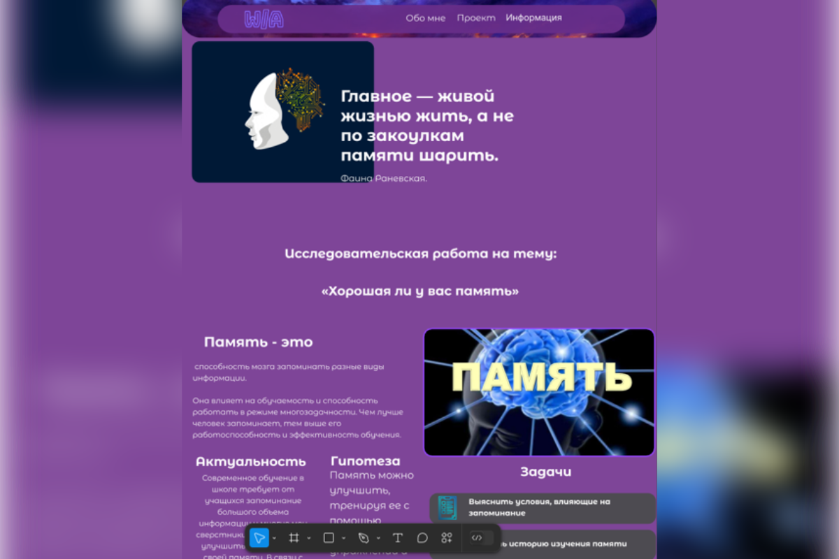 В проекте создан веб-сайт на тему «Хорошая ли у вас память». В своей работе я почувствовал себя веб-дизайнером (UX/UI) и frontend-разработчиком и могу с уверенностью сказать, что в будущем я хочу связать свою жизнь с веб-разработкой, так как это довольно интересный и можно сказать захватывающий опыт.