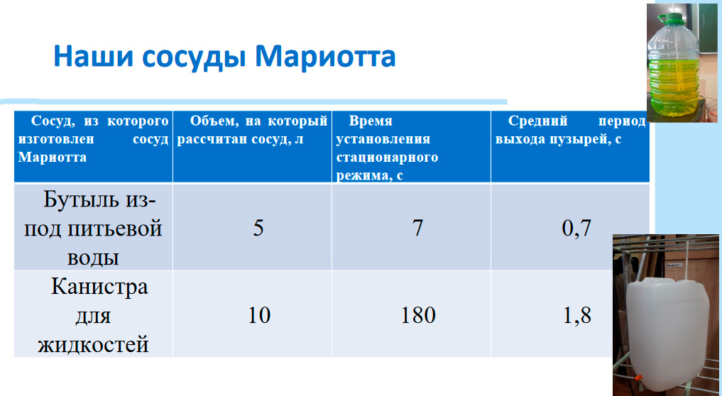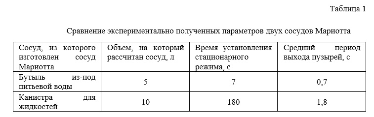 - В начале работы сосуда Мариотта уменьшается уровень воды как в основном объеме сосуда, так и в воздухозаборной трубке. В сосуде с твердыми стенками время установления равновесия очень мало, поэтому создается впечатление, что уровень воды в воздухозаборной трубке быстро уменьшается, после чего появляются пузыри. В сосуде с упругими стенками время установления рабочего режима увеличивается. Вероятно, что время установления равновесия тем больше, чем меньше жесткость стенок, так как именно смещение стенок не дает сильно уменьшиться давлению воздуха внутри сосуда.