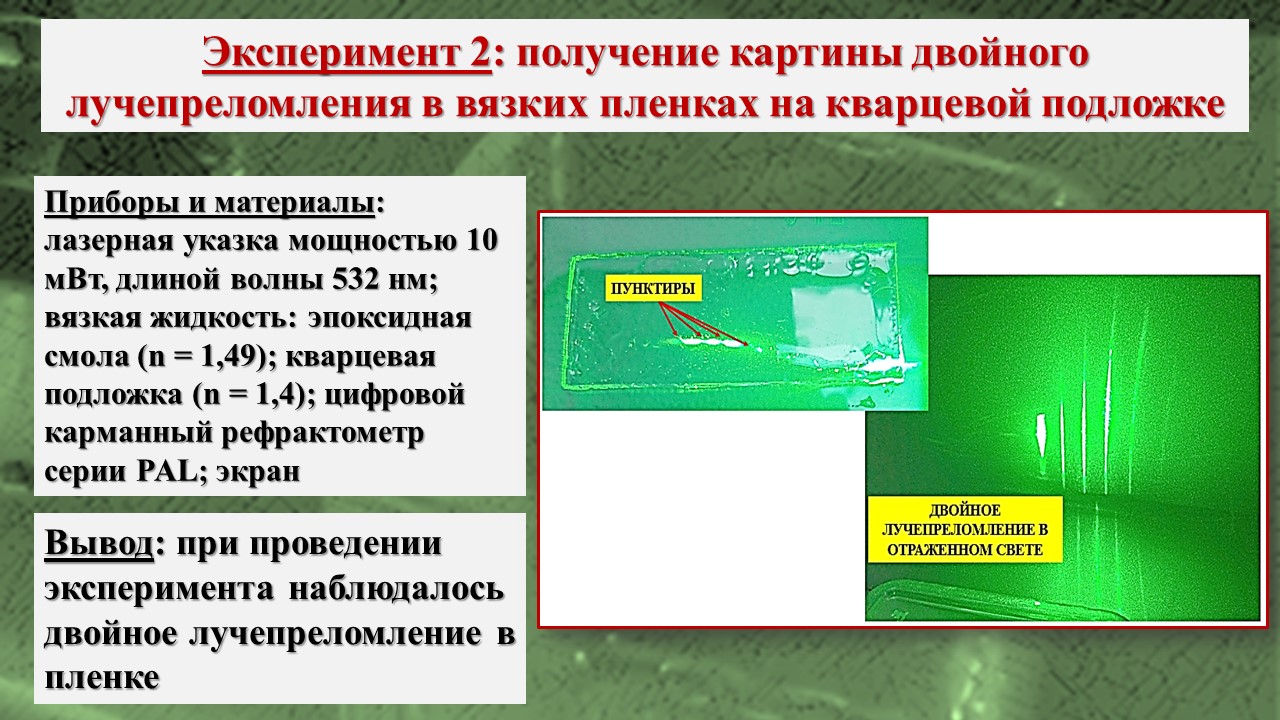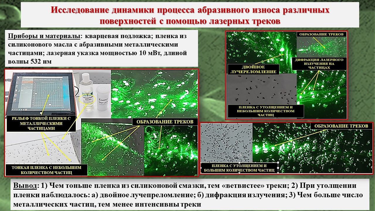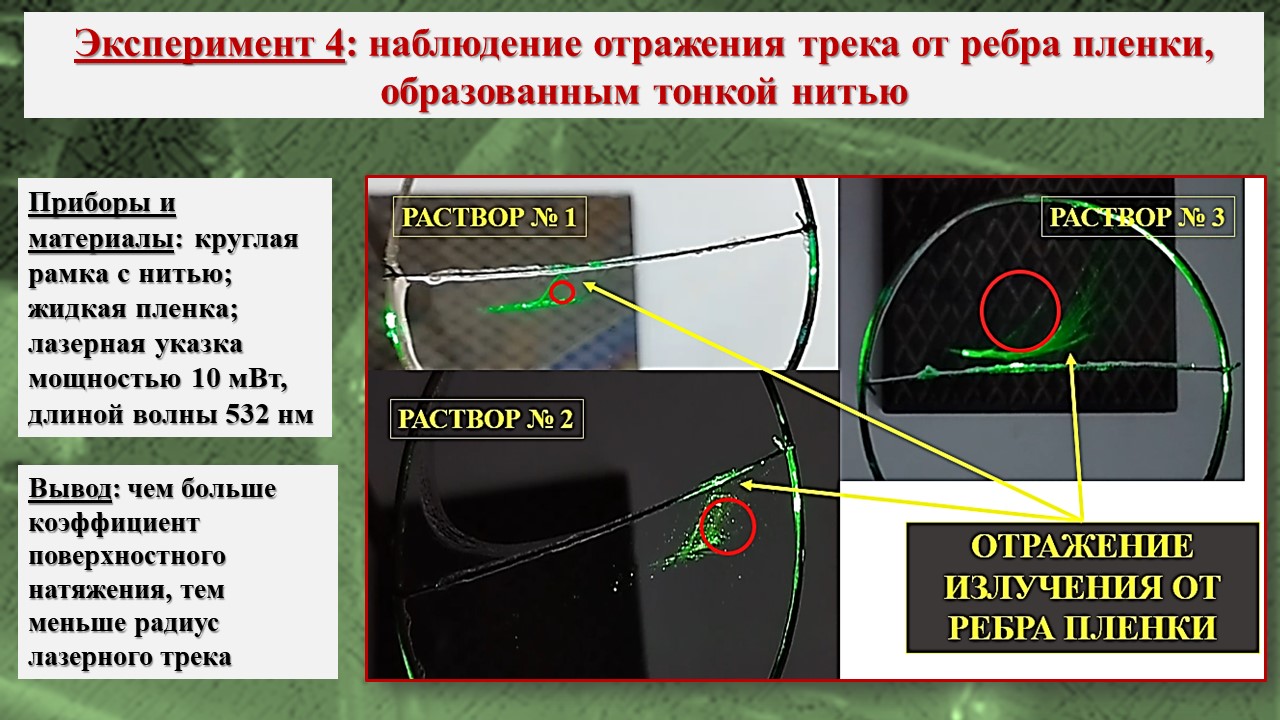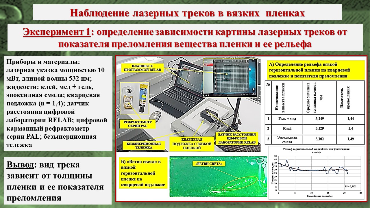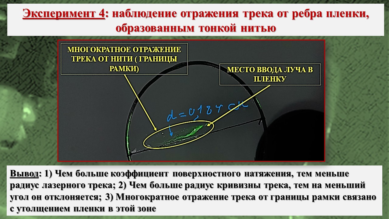 В исследовании, во-первых, было зарегистрировано возникновение треков лазерного излучения в тонких пленках на базе школьной инженерной лаборатории; во-вторых, экспериментально посредством компьютерной визуализации структуры пленки установлено, что причиной возникновения эффекта Старцева – Стойлова являются мелкомасштабные неоднородности, а сама дискретизация пучка на отдельные треки связана с волноводными свойствами пленки; в-третьих, установлены особенности распространения треков в различных тонких пленках, что позволяет изучать механизм действия низкоинтенсивного лазерного излучения на биообъекты, учитывая клеточную структуру живой ткани и природу клеточных мембран.