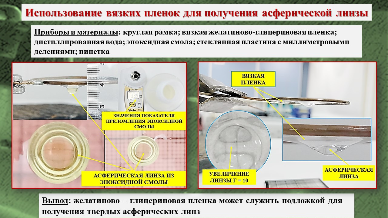 Данное исследование дополняется методом получения жидких и твердых асферических линз и определением их увеличения.