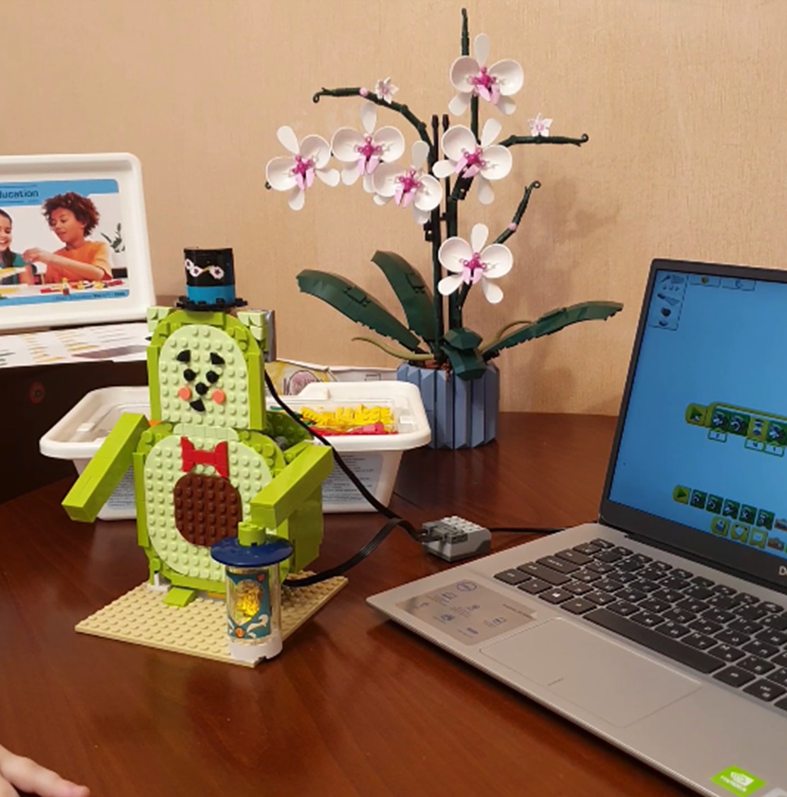 4. Запрограммировать робота-игрушку «Авокотик» с помощью набора блоков: робот должен поднимать и опускать лапку, включая фонарик; мурлыкать при прикосновении к ушку.