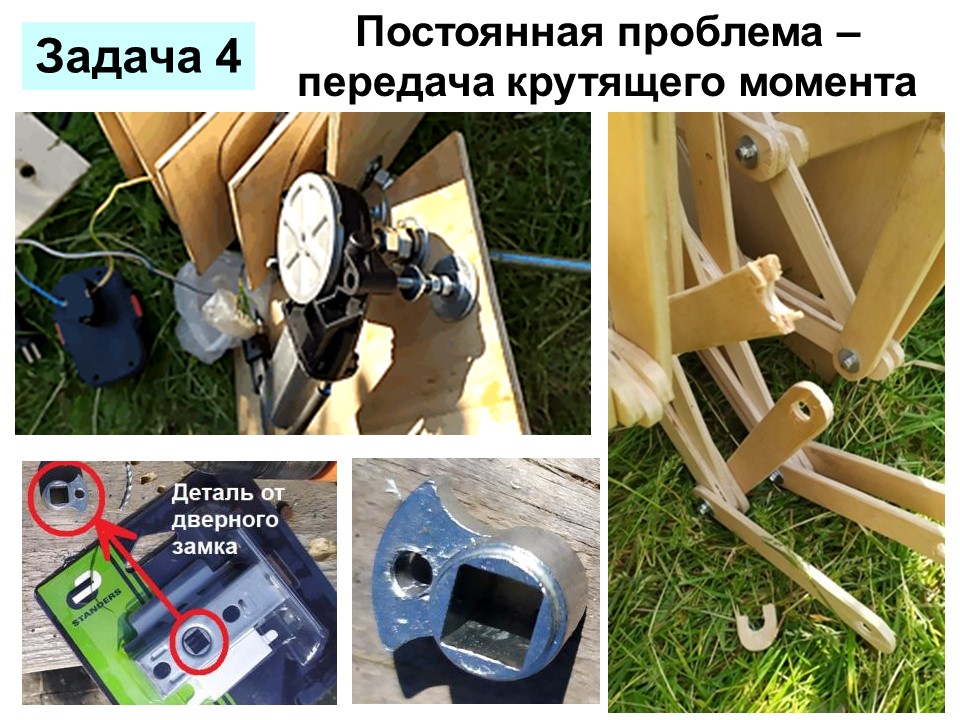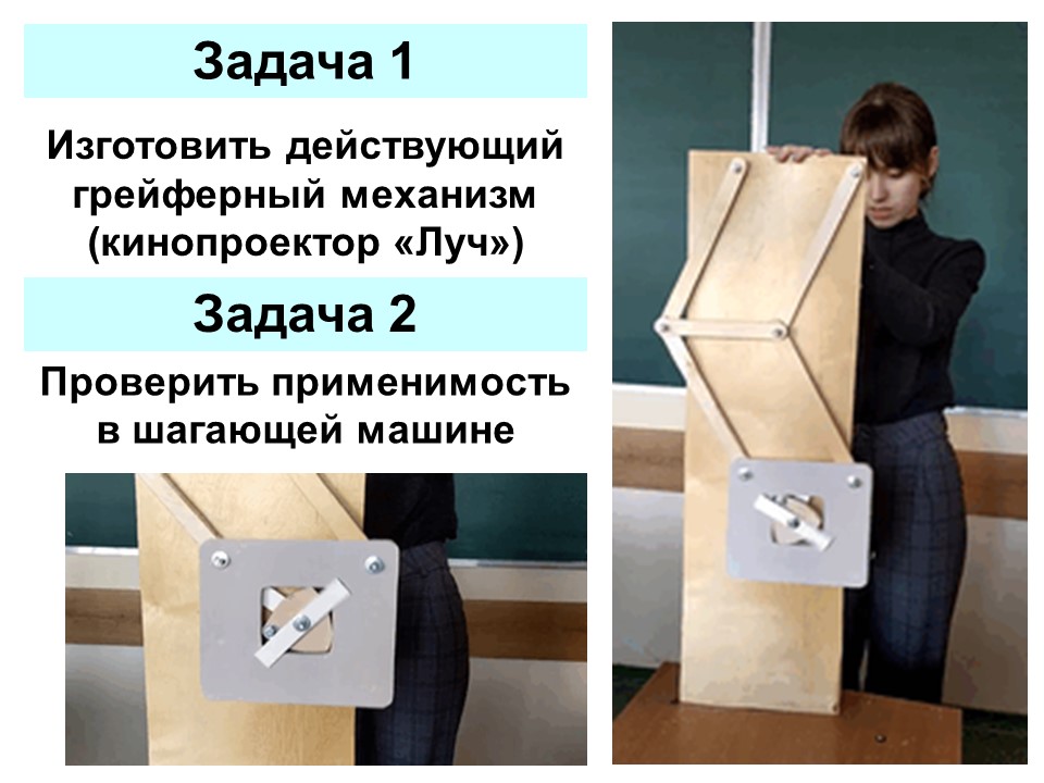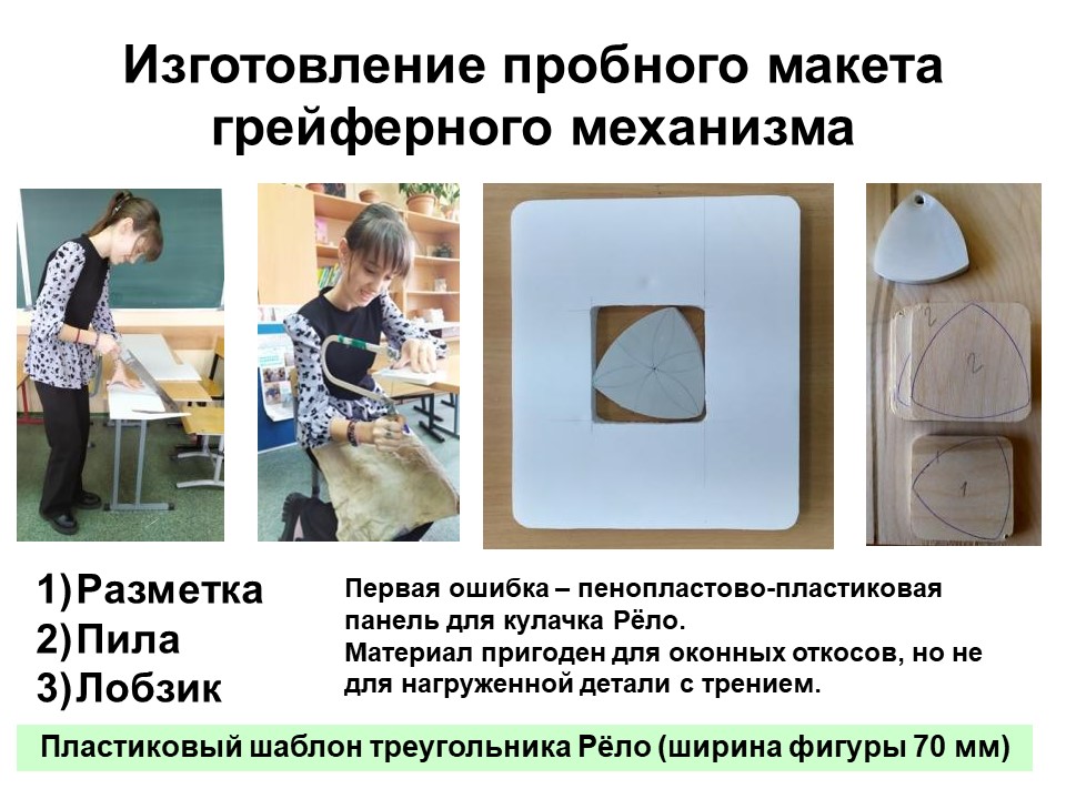 В качестве прототипа для новой шагающей машины был выбран грейферный механизм, причём простейший, от кинопроектора «Луч». Этот механизм основан на кривой постоянной ширины, на треугольнике Рёло. Однако сразу появилась трудность. Продолжительность активного участка всего 25% времени цикла. Для постоянной опоры понадобится, как минимум, четыре механизма. Но ведь автомобиль тоже на четырёх колёсах. Потребовалось провести эксперимент.