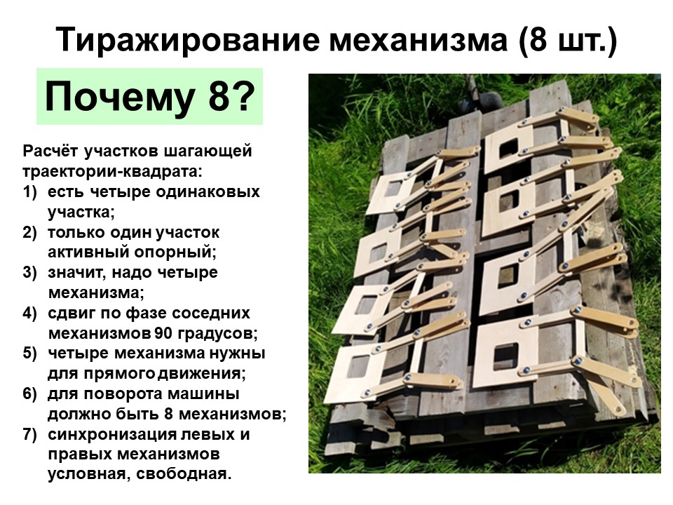 Цепляющие механизмы в этой работе не изучаются, хотя они актуальны, например, для горной местности. У шагающей траектории есть один самый главный недостаток – очень низкий подъём опоры, низкая высота шага. Но вместе с этим есть величайшее преимущество – вертикальные постановка и подъём опоры. Это важно не только для экологии, но и для жизни в широком понятии. Всегда ли нужна шагающая траектория. В Волгоградском университете была изготовлена машина-робот для сельского хозяйства с высоким подъёмом стопы и квадратной рабочей траекторией опоры. Но управлялась машина процессором. Цель работы – повторить компьютерный вариант механическим способом.