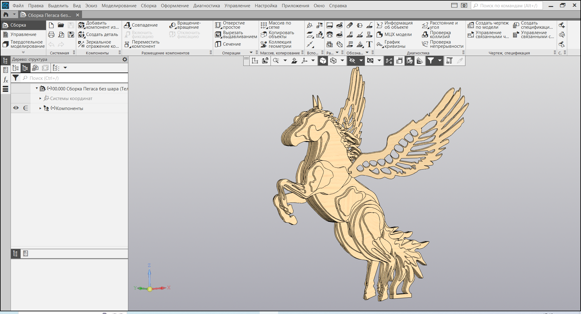 Для создания 3D-модели "Пегас" применялась программа трехмерного моделирования КОМПАС-3D. В процессе работы были использованы различные техники моделирования, такие как трехмерное моделирование, наложение текстур и освещение (приложение ArtisanRendering для создания фотореалистичных изображений в системе КОМПАС-3D), чтобы достичь максимально точного визуального представления объекта.
