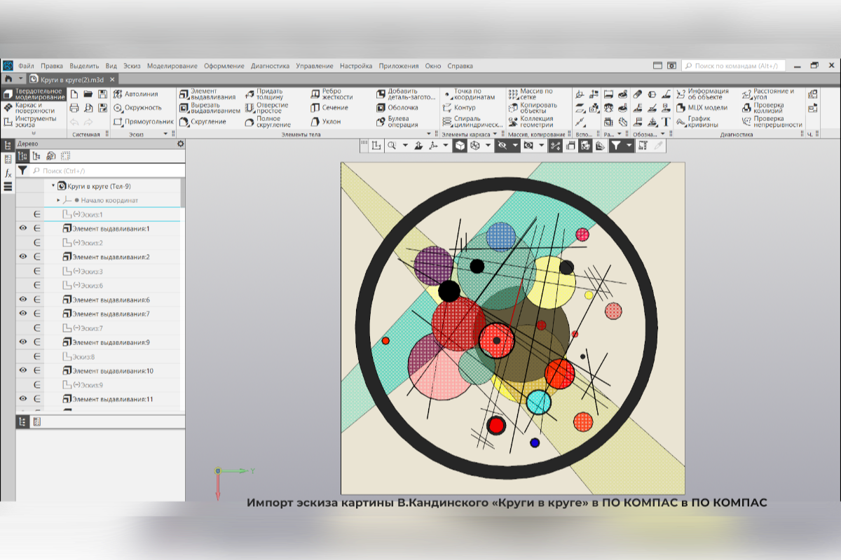 Данный проект посвящен разработке уникального арт-объекта, вдохновленного работами великого русского художника Василия Кандинского, выполненного с применением отечественного программного комплекса КОМПАС-3D. Основная цель состоит в создании высококачественной и реалистичной трехмерной модели, которая сможет успешно применяться как в инженерных разработках, так и в качестве самостоятельного художественного произведения.
