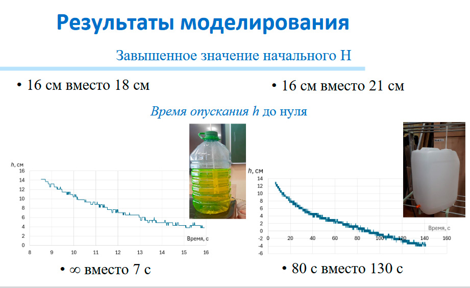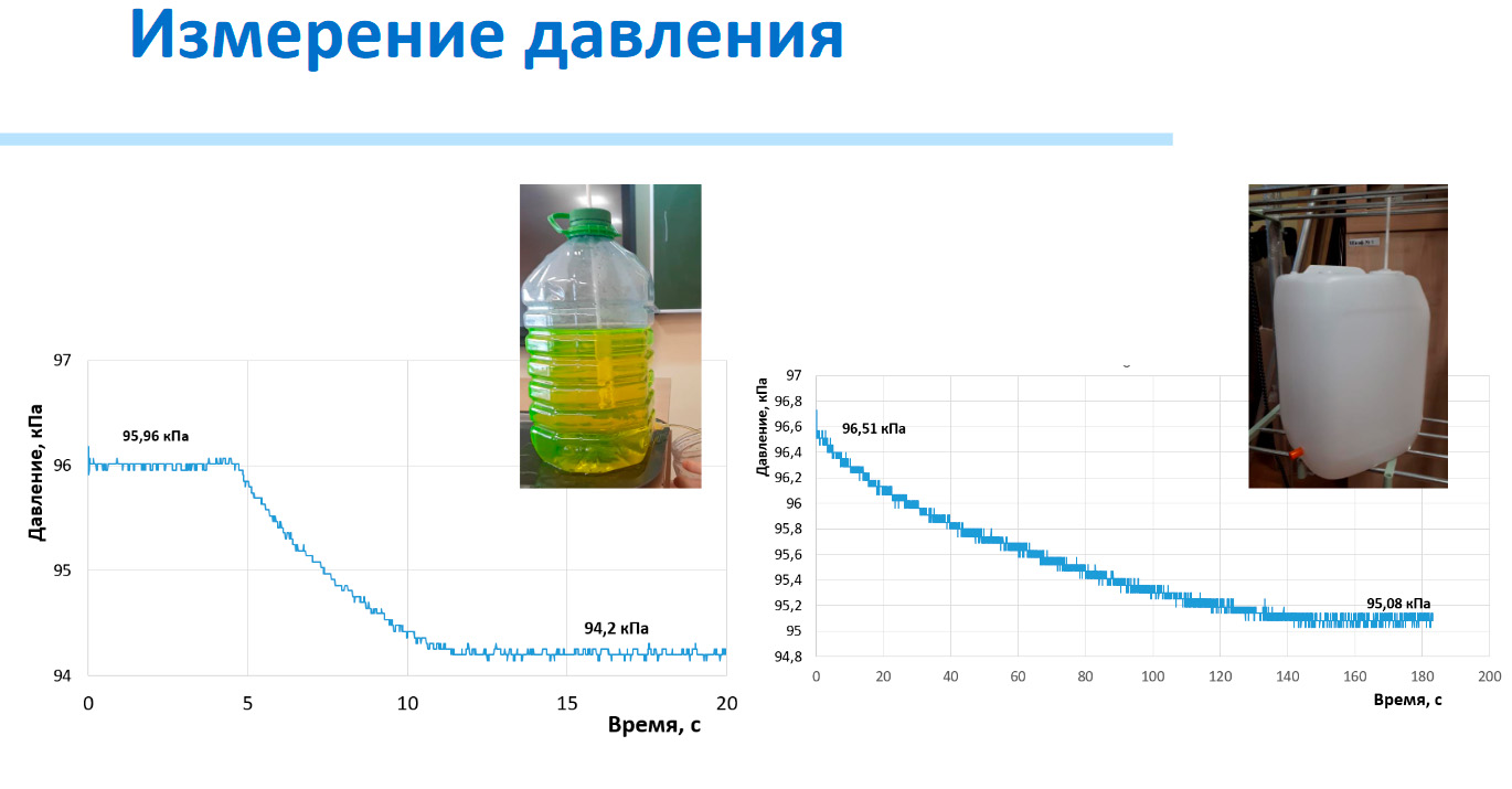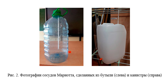 - В начале работы сосуда Мариотта уменьшается уровень воды как в основном объеме сосуда, так и в воздухозаборной трубке. В сосуде с твердыми стенками время установления равновесия очень мало, поэтому создается впечатление, что уровень воды в воздухозаборной трубке быстро уменьшается, после чего появляются пузыри. В сосуде с упругими стенками время установления рабочего режима увеличивается. Вероятно, что время установления равновесия тем больше, чем меньше жесткость стенок, так как именно смещение стенок не дает сильно уменьшиться давлению воздуха внутри сосуда.