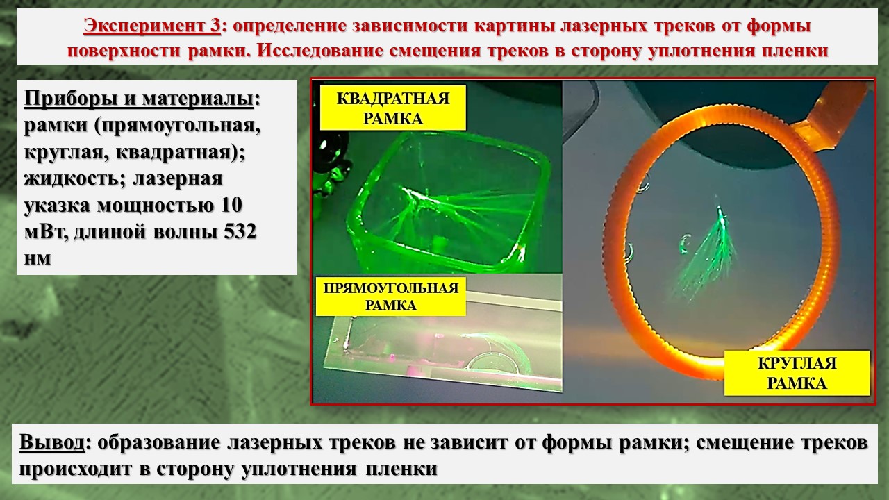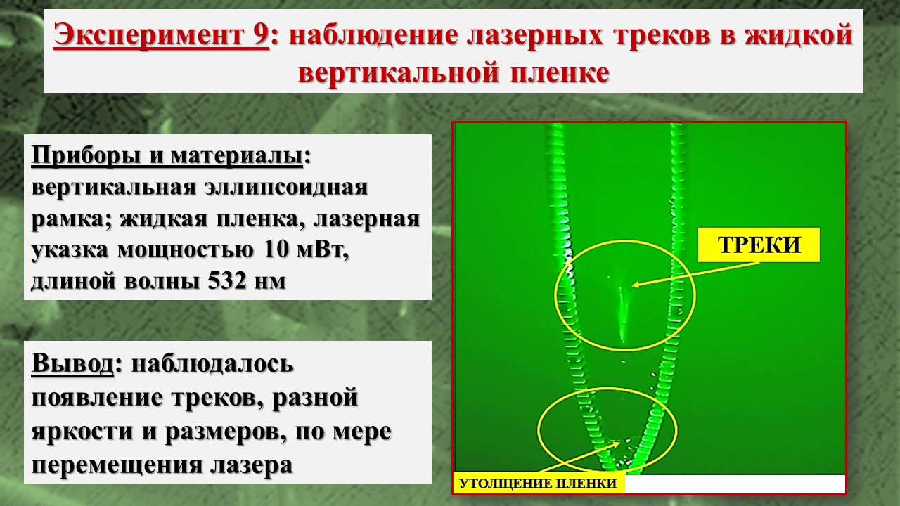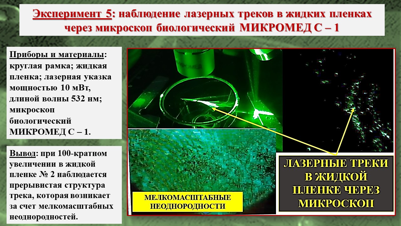 В исследовании, во-первых, было зарегистрировано возникновение треков лазерного излучения в тонких пленках на базе школьной инженерной лаборатории; во-вторых, экспериментально посредством компьютерной визуализации структуры пленки установлено, что причиной возникновения эффекта Старцева – Стойлова являются мелкомасштабные неоднородности, а сама дискретизация пучка на отдельные треки связана с волноводными свойствами пленки; в-третьих, установлены особенности распространения треков в различных тонких пленках, что позволяет изучать механизм действия низкоинтенсивного лазерного излучения на биообъекты, учитывая клеточную структуру живой ткани и природу клеточных мембран.