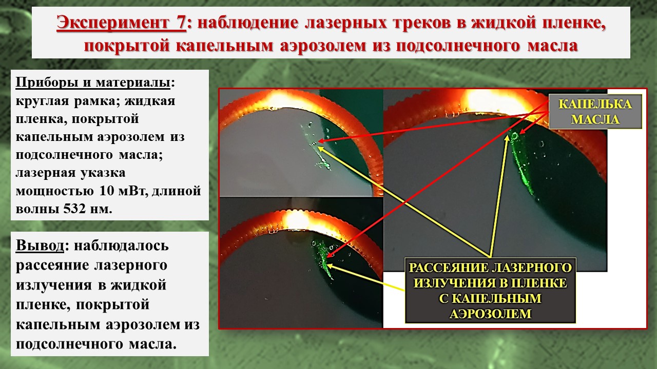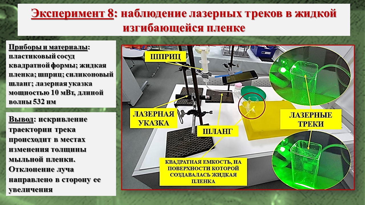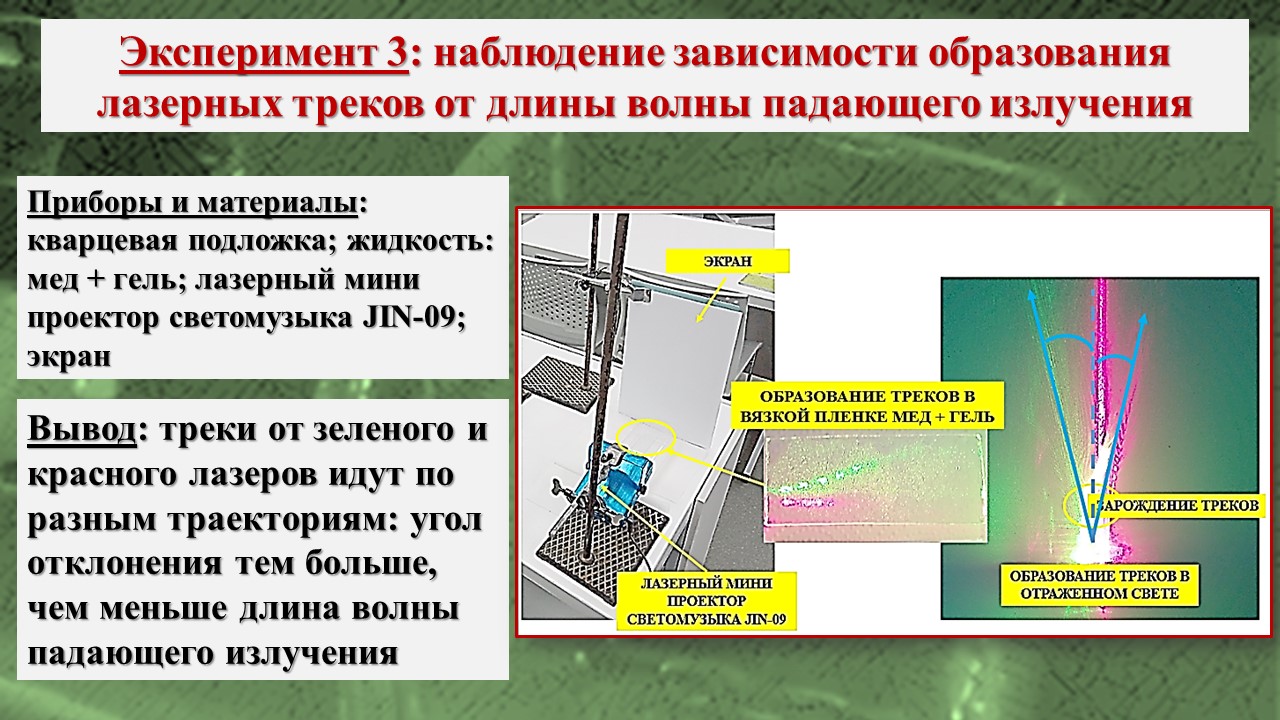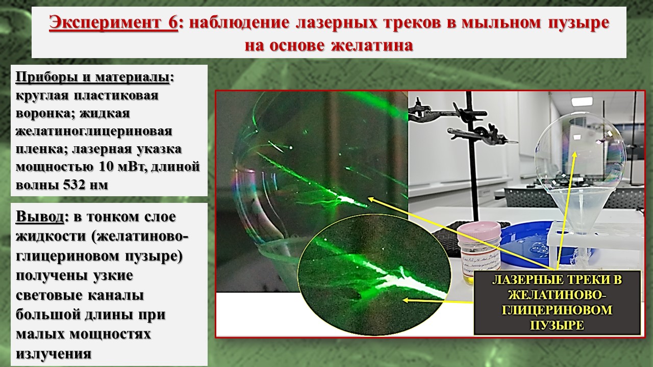 В исследовании, во-первых, было зарегистрировано возникновение треков лазерного излучения в тонких пленках на базе школьной инженерной лаборатории; во-вторых, экспериментально посредством компьютерной визуализации структуры пленки установлено, что причиной возникновения эффекта Старцева – Стойлова являются мелкомасштабные неоднородности, а сама дискретизация пучка на отдельные треки связана с волноводными свойствами пленки; в-третьих, установлены особенности распространения треков в различных тонких пленках, что позволяет изучать механизм действия низкоинтенсивного лазерного излучения на биообъекты, учитывая клеточную структуру живой ткани и природу клеточных мембран.
