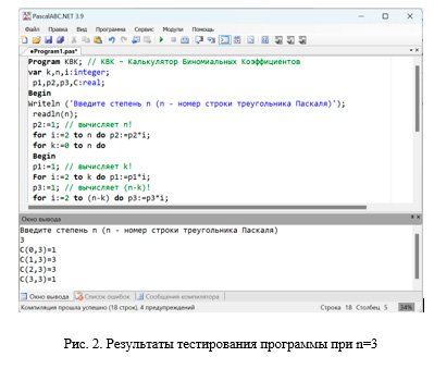 «Калькулятор биномиальных коэффициентов» был протестирован и для многих других значений n. Во всех этих случаях им были выданы верные результаты.Очевидна практическая значимость нашего проекта, которая состоит в том, что написанная в его рамках компьютерная программа позволяет «переложить на плечи ЭВМ» те нудные, долгие и однообразные вычисления, которые приходится проделывать при раскрытии скобок.