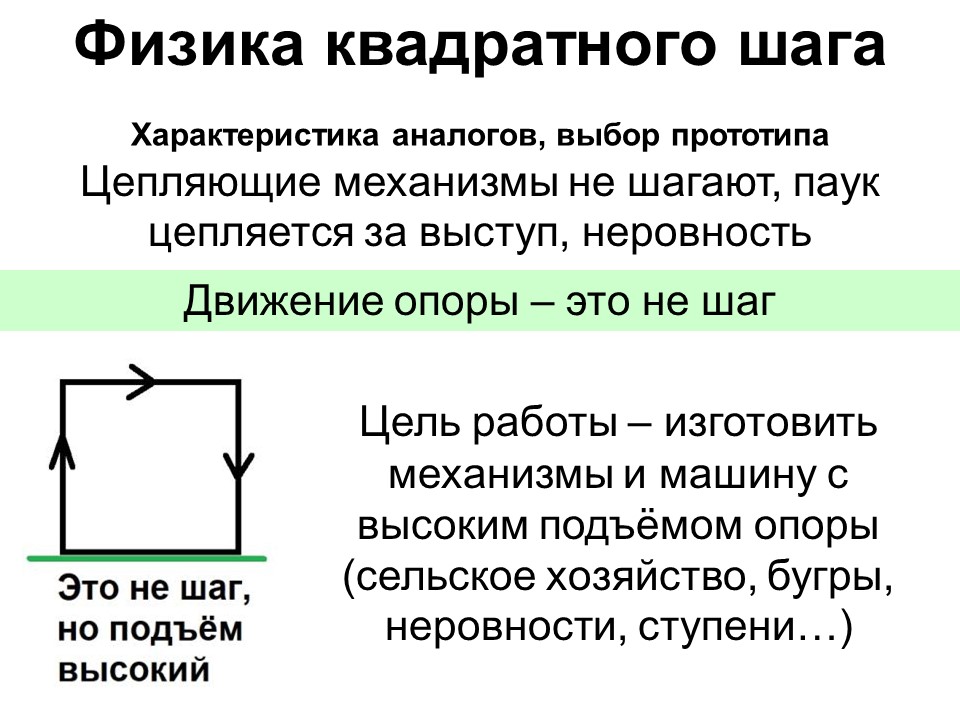 Цепляющие механизмы в этой работе не изучаются, хотя они актуальны, например, для горной местности. У шагающей траектории есть один самый главный недостаток – очень низкий подъём опоры, низкая высота шага. Но вместе с этим есть величайшее преимущество – вертикальные постановка и подъём опоры. Это важно не только для экологии, но и для жизни в широком понятии. Всегда ли нужна шагающая траектория. В Волгоградском университете была изготовлена машина-робот для сельского хозяйства с высоким подъёмом стопы и квадратной рабочей траекторией опоры. Но управлялась машина процессором. Цель работы – повторить компьютерный вариант механическим способом.