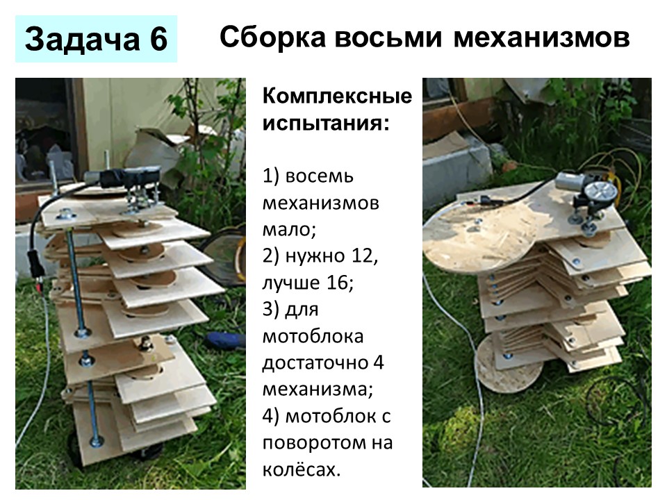 Натурные испытания доказали правильность предложенного технического решения. Мотоблок из двух сборок по 4 механизма способен поворачивать, изменять направление движения. Высота шага большая, 50 мм при теоретической ширине кулачка Рёло 70 мм, но практической детали 50 мм. Высота шага равна длине шага. Правда, чем-то приходится жертвовать. В этой машине скоростью. Стопоходящая машина П.Л.Чебышева очень медленная, а Рёлоход движется медленнее её в 8/3 раза. Но зато проходимость повышена.