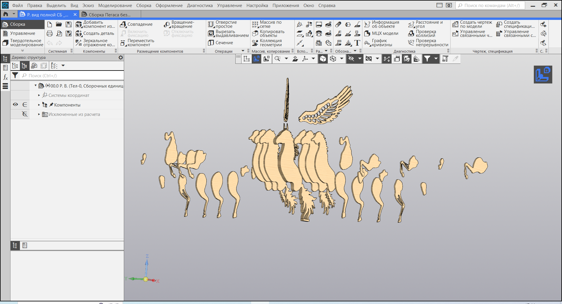 Для создания 3D-модели "Пегас" применялась программа трехмерного моделирования КОМПАС-3D. В процессе работы были использованы различные техники моделирования, такие как трехмерное моделирование, наложение текстур и освещение (приложение ArtisanRendering для создания фотореалистичных изображений в системе КОМПАС-3D), чтобы достичь максимально точного визуального представления объекта.