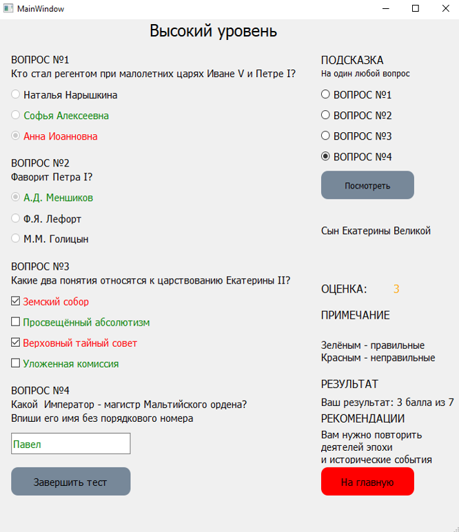 Цель проекта – создание приложения в формате компьютерного тестирования с помощью языка программирования Python 3.7 для оценки усвоения материала по истории России конца XVII – XVIII веков.